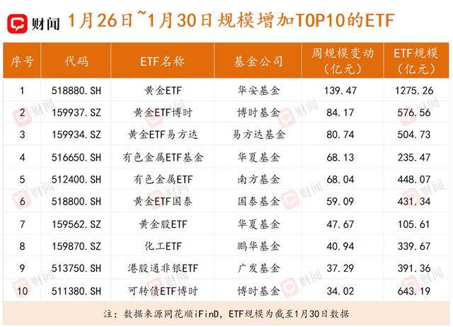 上周,在黄金及有色金属板块整体上涨、同时持续吸引资金净流入的双重推动下,华安基金旗下的黄金ETF(518880.SH)规模显著扩张,单周增长达139.47亿元,成为上周全市场唯一一只规模增量超百亿元的ETF。截至1月30日,其总规模已攀升至1275.26亿元。