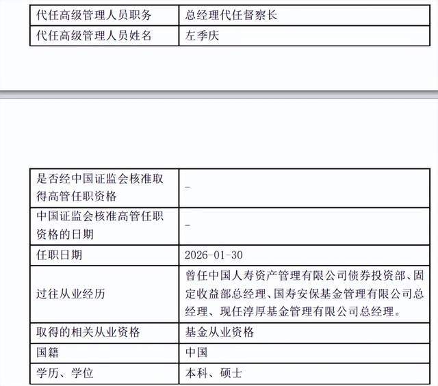 距长宁国资拿下淳厚基金实控权、核心高管“换血”刚满三周,1月31日,公司再次迎来两名高管变更。根据公司公告,因工作安排,督察长沈志婷离任,由总经理左季庆代任督察长;新任首席信息官(副总经理)刘玉生正式上任。至此,国资股东成为淳厚基金的实控人后,公司高管团队全面大洗牌。