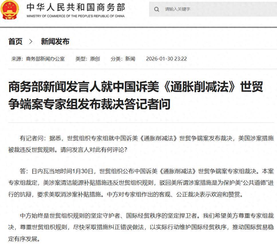 2024年3月,中国终于按捺不住,正式向世贸组织提起诉讼,并于7月申请设立专家组审查这些条款。在经过一年多的审理后,世贸组织终于在今年1月30日给出了一个具有决定性的裁决:美国的清洁能源补贴政策违反了世贸规则,驳回了美国关于保护公共道德的无理抗辩,并要求美国在2024年10月1日前取消相关补贴。面对这样的裁决,中国第一时间表达了欢迎与赞赏,商务部明确指出,中国始终是世贸规则的坚定守护者。虽然没有直接点名美国,但谁都知道这句话的指向明确——就是在打美国的脸。与此同时,美国方面却表现得极为愤怒,贸易代表格里尔毫不掩饰地批评裁决荒谬,并质疑世贸组织的监管能力。这种输不起的态度,真是让人看了不禁摇头。