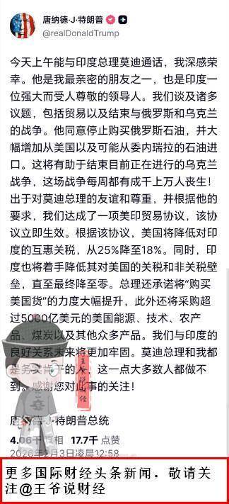 注意了!这可不是什么小打小闹的调整。就在2月3日,特朗普亲自发推官宣: 美国对印度的关税,从之前的25%甚至最高50%,直接降到18%!