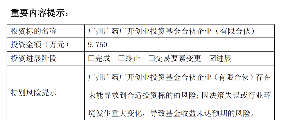 白云山在此次公告中表示,本次投资符合广药二期基金的投资方向,有利于扩大广药二期基金投资规模、分散投资风险及加快投资步伐、提高投资效率,将加强白云山在创新药、现代中药、高端医疗器械等生物医药前沿领域的布局,通过“投早、投小、投未来”,前瞻介入优质企业源头,培育孵化潜力企业,加快实现技术升级与价值链延伸,推动白云山从传统业务模式向以科技创新驱动发展的模式转变,为高质量发展奠定坚实基础。