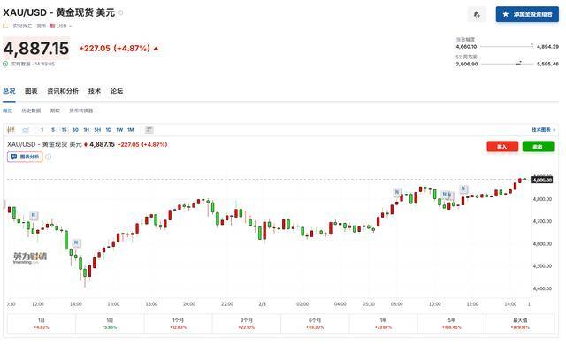 周一,因芝加哥商品交易所集团(CME)提高保证金要求,跌势进一步扩大。而随着投资者重新评估此次暴跌是否预示着结构性转折点,还是对短期催化剂的过度反应,国际金银价格终于在周二迎来强势反弹。现货黄金涨幅已扩大至4.87%,徘徊在4900美元/盎司附近;现货白银亦反弹回升,涨幅一度扩大至8%。
