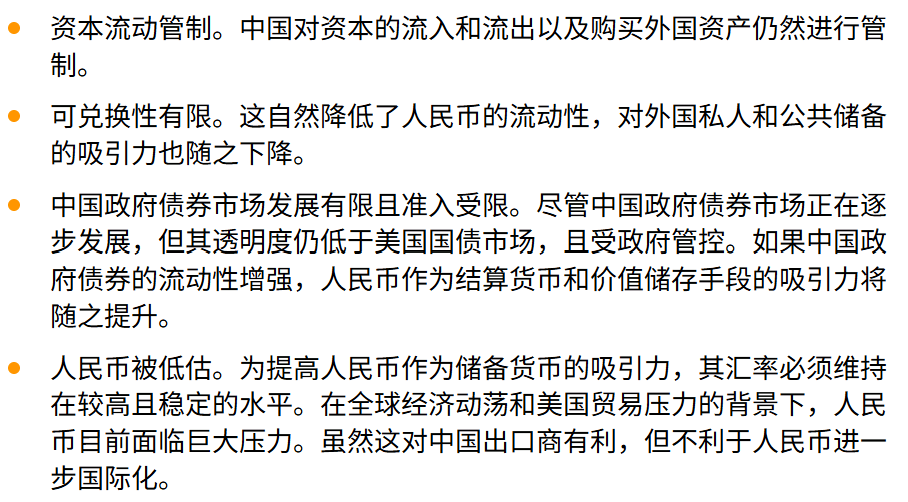 目前仍有诸多限制影响人民币成为完全国际货币: