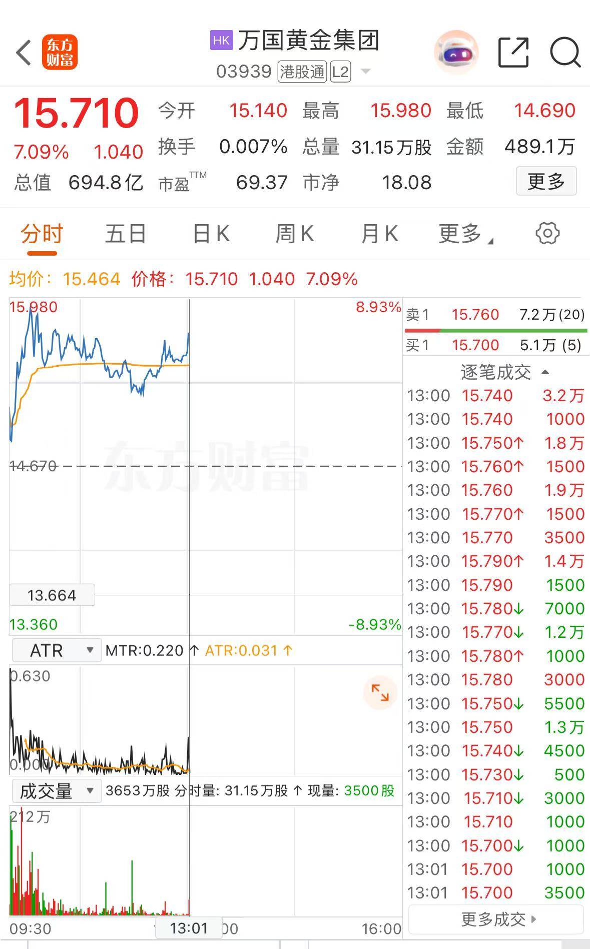 2月4日,万国黄金集团高开后震荡上行,盘中一度涨近9%。截至13时01分,万国黄金集团涨7.09%,报15.71港元/股。