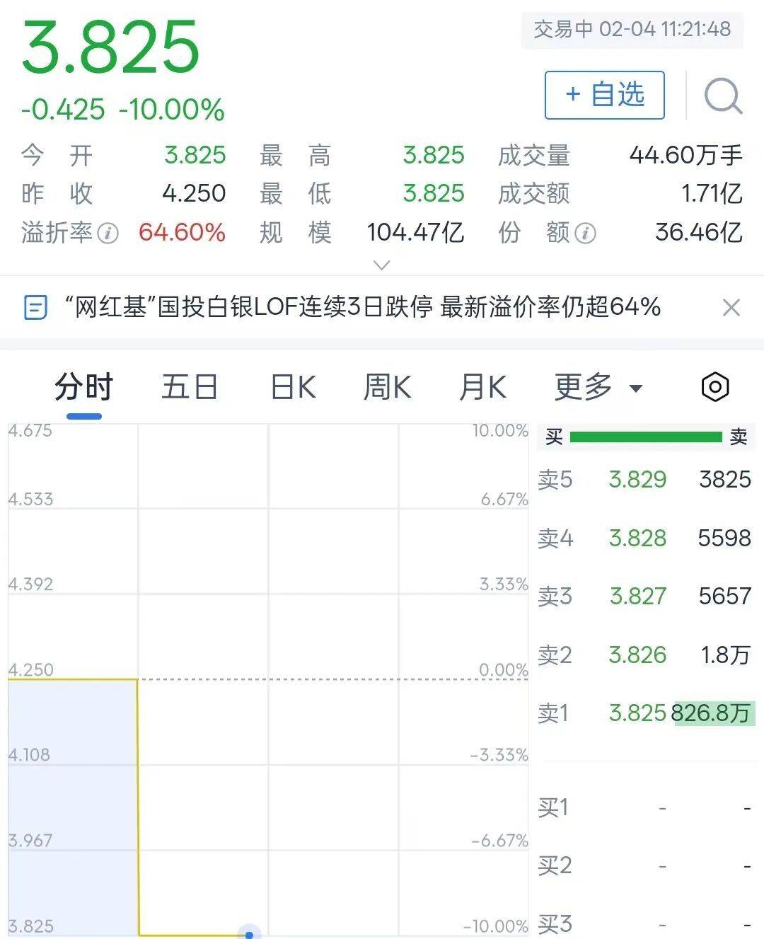 2月4日,国投白银LOF复牌后再度跌停,已连续三日跌停,现报3.825元,溢价率为64.6%。