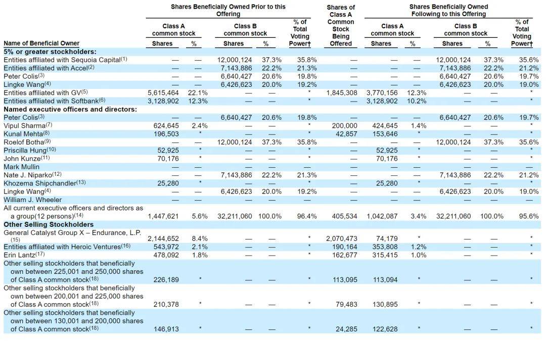 IPO后,Sequoia Capital持有37.3%的B类股,有35.6%投票权;Accel持有22.2%的B类股,21.2%的投票权;