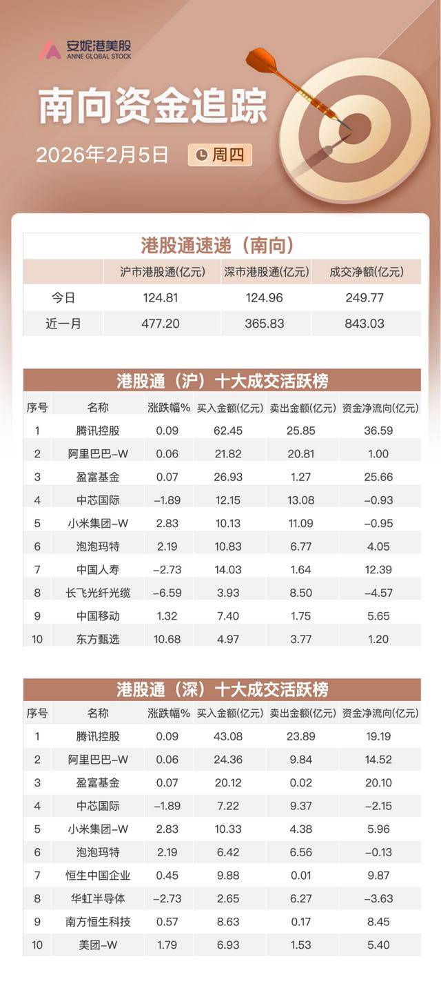 大幅净买入:腾讯控股(0700.HK)55.78亿港元;中国人寿(02628.HK)12.39亿港元;阿里巴巴-W(09988.HK)15.53亿港元;美团-W(03690.HK)5.40亿港元;泡泡玛特(09992.HK)3.92亿港元;东方甄选(01797.HK)1.20亿港元。