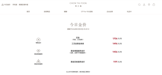 1月29日,多家金饰品牌足金报价突破1700元/克。其中,周大福报1706元/克,较昨日上涨88元/克;周生生报1708元/克,较昨日上涨94元/克;老庙黄金报1706元/克,较昨日上涨94元/克;老凤祥报1713元/克,较昨日上涨93元/克。