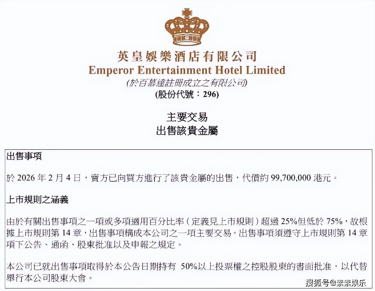 2月5日,媒体证实英皇娱乐把酒店大堂的标志“黄金大道”里的全部金砖给出售掉了。