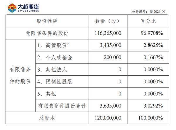 中国网财经2月6日讯 日前,大越期货(证券代码:839979)发布《大越期货股份有限公司股票解除限售公告》披露,本次股票解除限售数量总额为137,500股,占公司总股本0.1146%,可交易时间为2026年2月9日。