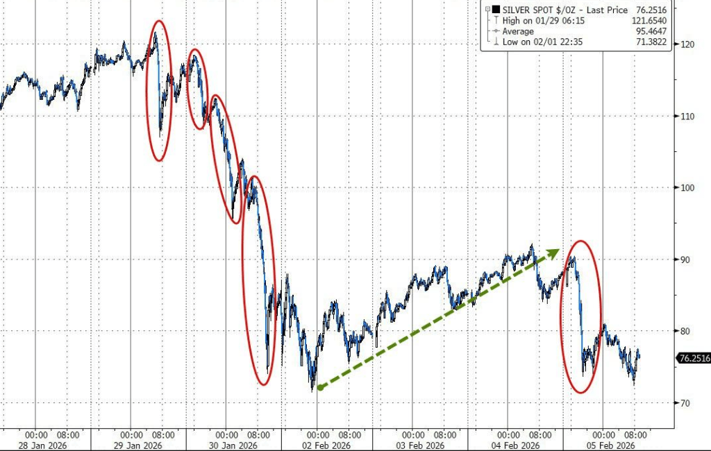 结局来得极快。2月初,白银价格从高位自由落体,短短几天内暴跌至70美元附近。