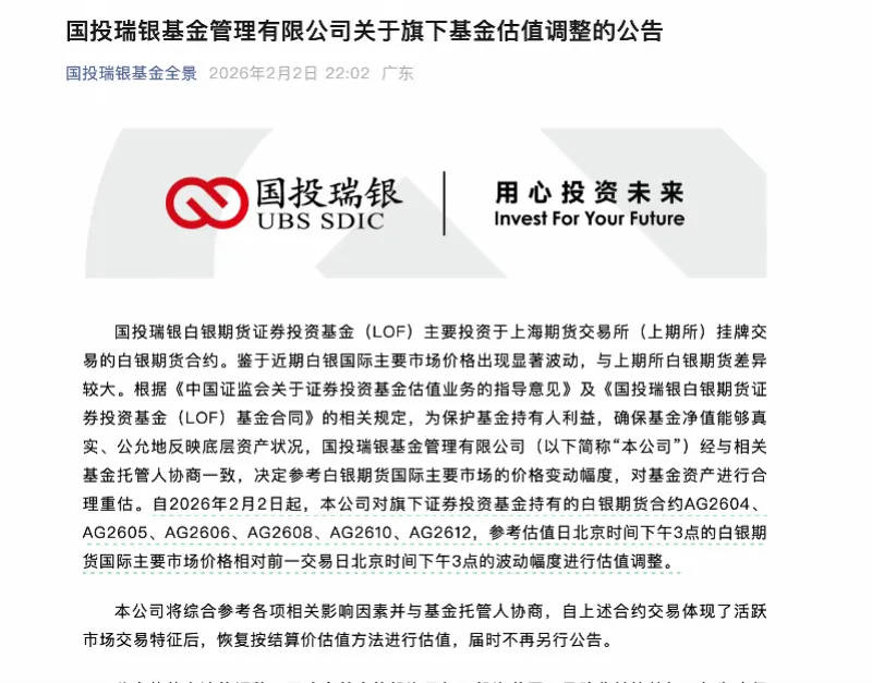 根据国投瑞银2月2日晚间发布的《关于旗下基金估值调整的公告》,公司决定自当日起,对国投白银LOF持有的AG2604、AG2605、AG2606、AG2608、AG2610、AG2612共6只白银期货合约,调整估值计算规则。