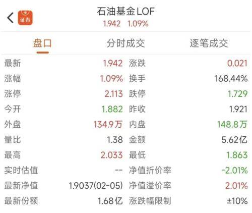华安石油LOF二级市场溢价率此前一度突破40%。然而,截至2月6日收盘,华安石油LOF的二级市场交易价格为1.942元,东方财富证券软件中显示的净值溢价率仅为2.01%。该溢价率是根据基金在二级市场的交易价格与其最新公布的基金份额净值(截至2月5日)计算得出。