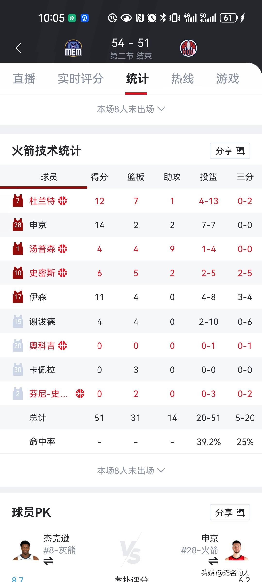 火箭这边杜兰特13中4低迷,半场12+7+1,申京7中7拿下14+2+2,最近篮板抢的不好,阿们汤普森4+4+9,助攻很多,有望创生涯新高,小贾巴里史密斯6+5+2马马虎虎,伊森状态不错,拿下11+4,进了三个三分,谢泼德打铁不断,10中2,三分6中0得到4分,也是替补唯一得分,奥科吉,卡佩拉,芬尼史密斯都没有得分。