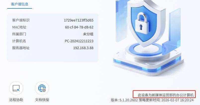 它的员工客户端支持自定义修改归属,比如这里是新媒体运营部的办公计算机,可以修改为“某某公司办公计算机”,不仅规范管理,还在物理层面上增加了公司的公信力和归属感,让员工时刻意识到“这是公司的电脑”。