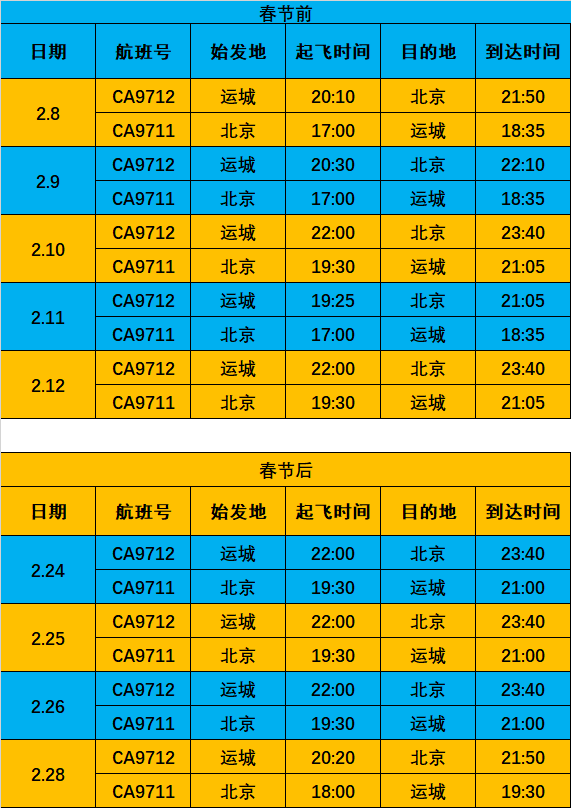 为保障春运期间旅客出行需求,将加密一班运城至北京首都机场的航班,加密时段为2026年2月8日至2月12日、2月24日至2月26日以及2月28日。