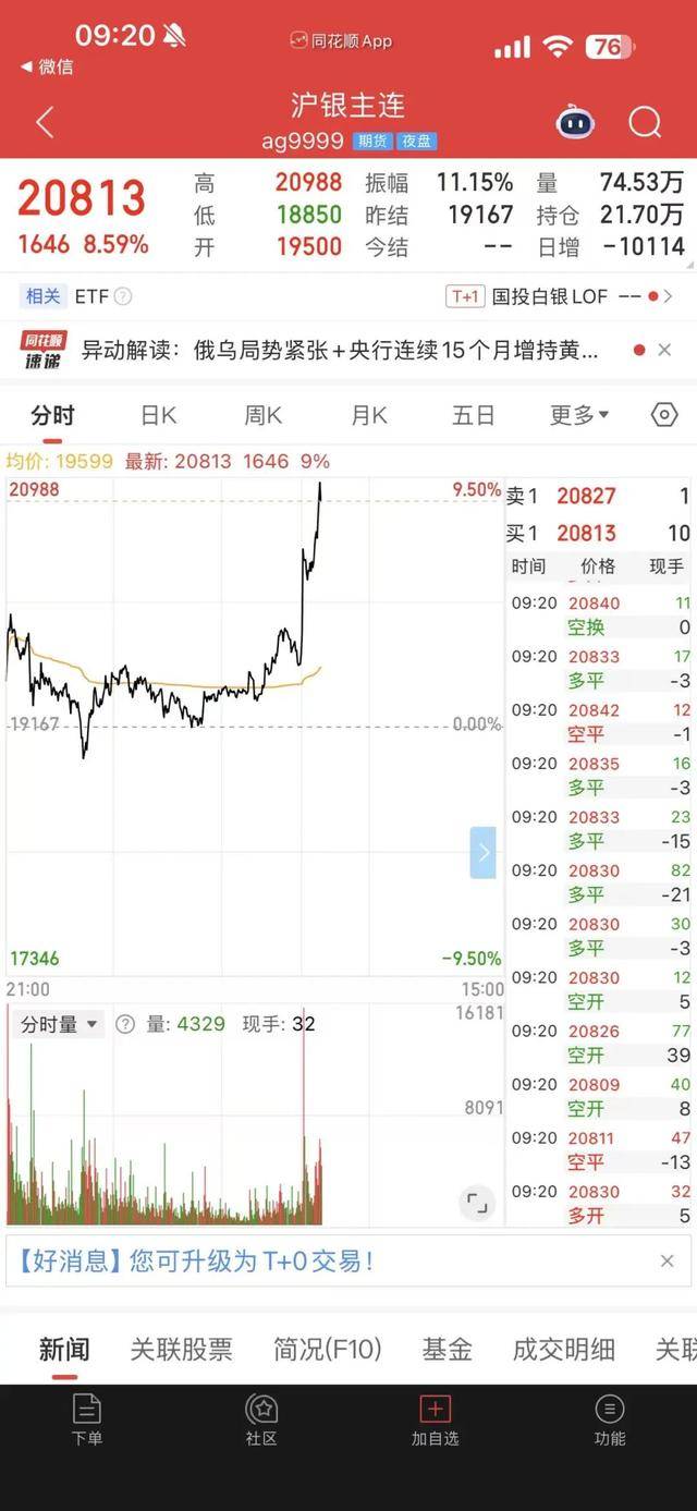 上期所沪银主力合约大涨超8%,盘中一度大涨9%,报20813元/千克。COMEX白银期货涨超4%,现报80.13美元/盎司。