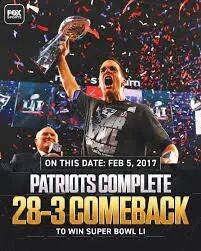2017年,汤姆·布雷迪率领的爱国者队在第三节还剩不到一半时间时,以3-28落后。