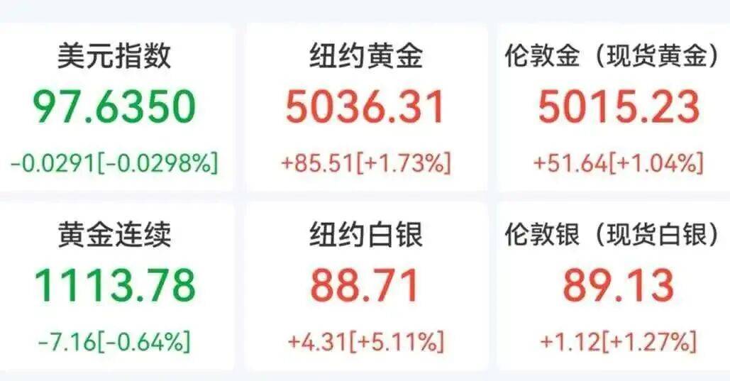 继暴力反弹后国际贵金属继续大涨,2月4日早盘,现货黄金开盘直线拉升,重新站上5000美元/盎司,最新报5030.14美元/盎司,涨近1.8%。COMEX黄金期货报5073.5美元/盎司,上涨2.81%。现货白银开盘一度跌超2%,随后快速拉升。