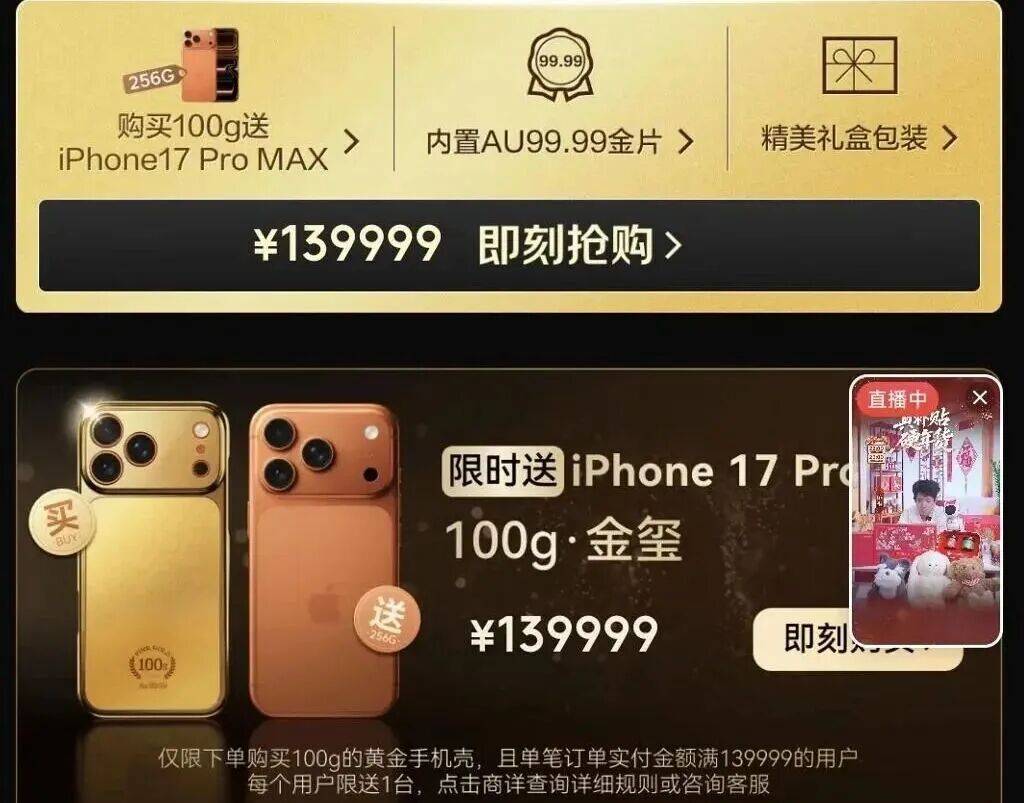 ● 买139999元黄金手机壳送苹果17ProMax?商家:属实,内置Au99.99金片。