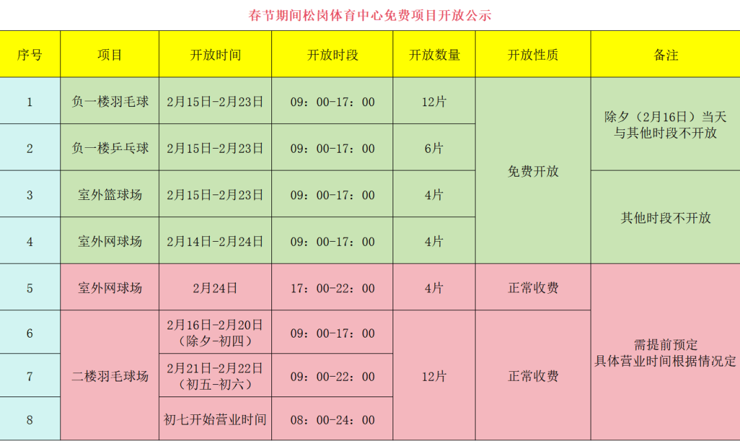 ● 宝安:春节期间松岗体育中心各运动项目开放时间公布。