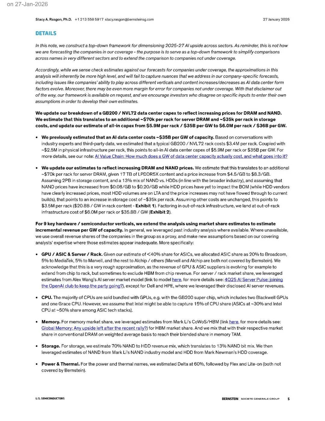 一、研究框架与目的这篇报告构建了一个自上而下的框架,用于量化2025-2027年人工智能在各硬件及半导体垂直领域的上行空间。需要明确的是,这并非作者覆盖公司的具体预测方法,而是作为一个简化比较工具,帮助投资者跨行业比较不同公司,并将比较范围延伸至非覆盖公司。该框架通过市场规模(TAM)每吉瓦(GW)成本、市场份额及增量利润率的乘积,估算各公司可捕获的增量利润。