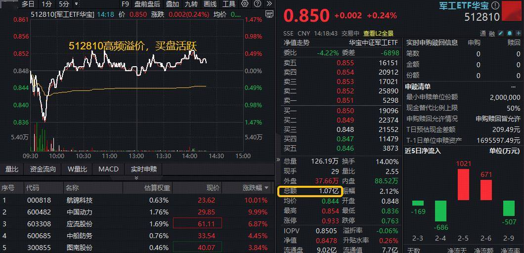 2月10日,军工板块早盘V字回升翻红,午后维持红盘震荡。高人气军工ETF华宝(512810量能异动引发关注,截至发稿,场内成交额1亿元,较昨日全天暴增逾150%!结合场内高频溢价来看,或有巨量资金介入。