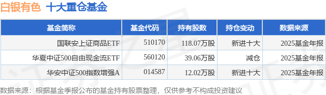 根据2025基金年报公募基金重仓股数据,重仓该股的公募基金共3家,其中持有数量最多的公募基金为国联安基金的国联安上证商品ETF。国联安上证商品ETF目前规模为3.22亿元,最新净值1.438(2月9日),较上一交易日上涨1.77%,近一年上涨62.85%。该公募基金现任基金经理为黄欣。黄欣在任的基金产品包括:国联安中证A100指数(LOF),管理时间为2010年4月16日至今,期间收益率为128.86%;国联安上证商品ETF联接A,管理时间为2010年12月1日至今,期间收益率为70.01%;国联安中证医药100A,管理时间为2016年8月19日至今,期间收益率为-0.95%。