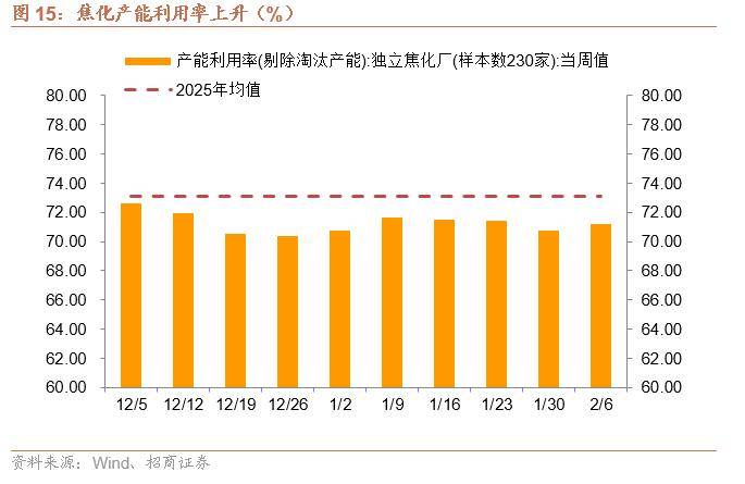 上周焦化产能利用率71.23%,环比上升0.48个百分点,同比增速为-2.0%。