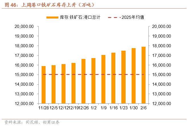 上周港口铁矿石库存环比上升156.42万吨至17914.68万吨。