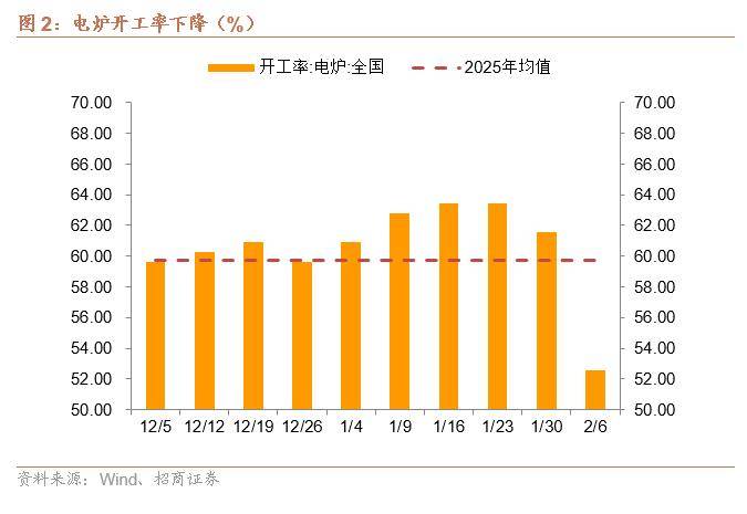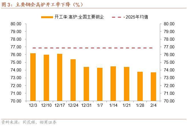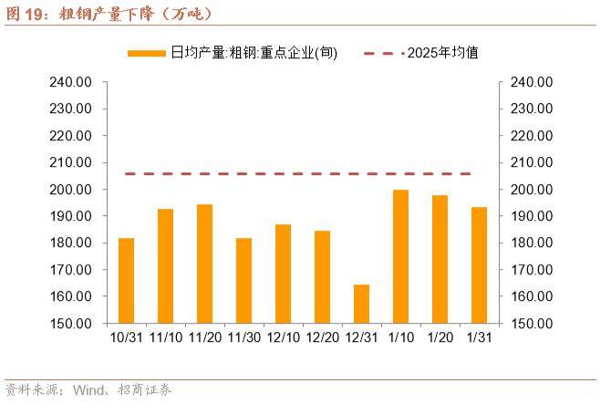 1月下旬重点企业粗钢日均产量为193.5万吨,较1月中旬下降4.4万吨,同比增速为-8.3%。
