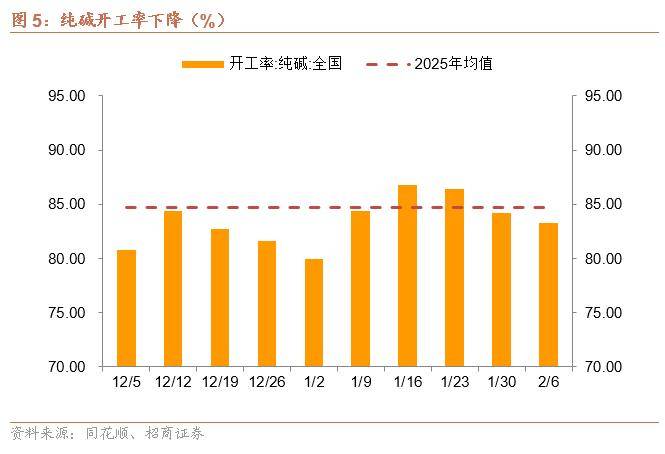 上周纯碱开工率为83.25%,环比下降0.94个百分点,同比增速为-5.4%。