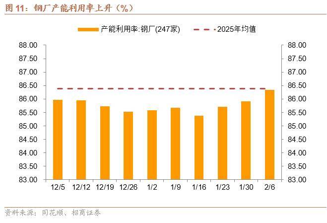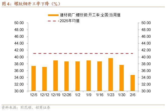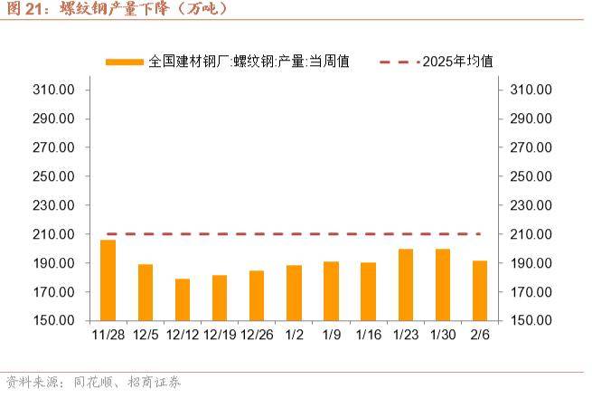 1月下旬重点企业钢材日均产量为193.6万吨,比1月中旬上升5.9万吨,同比增速为-4.3%。