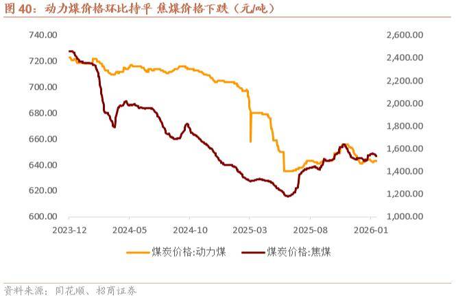 上周动力煤价格为643元/吨,环比持平,焦煤价格为1535元/吨,环比下跌19元/吨。