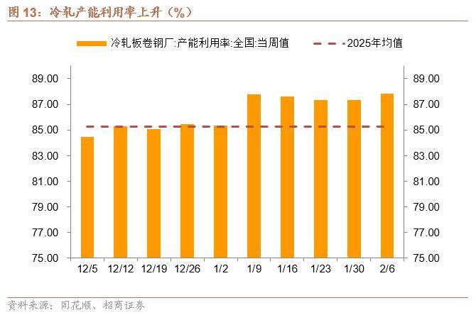 上周冷轧产能利用率87.81%,环比上升0.46个百分点,同比增速为6.7%。