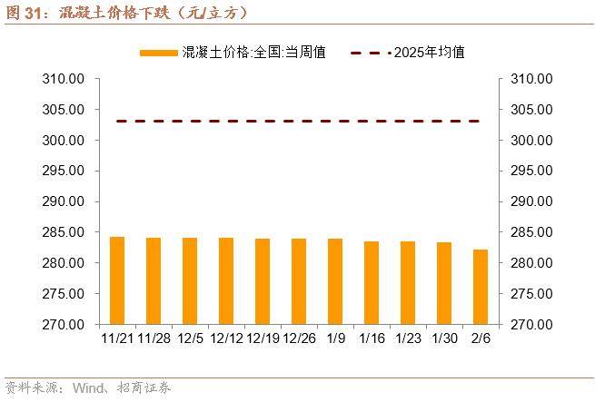 上周混凝土价格为282.18元/立方,环比下跌1.2元/立方,同比增速为-13.2%。