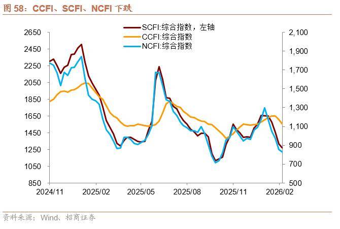 上周,SCFI为1266.56,环比下跌3.8%,CCFI为1122.15,环比下跌4.5%,NCFI为827.23,环比下跌3.0%。