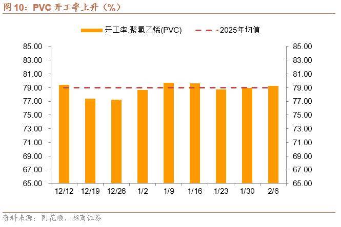 上周PVC开工率为79.26%,环比上升0.33个百分点,同比增速为-3.2%。
