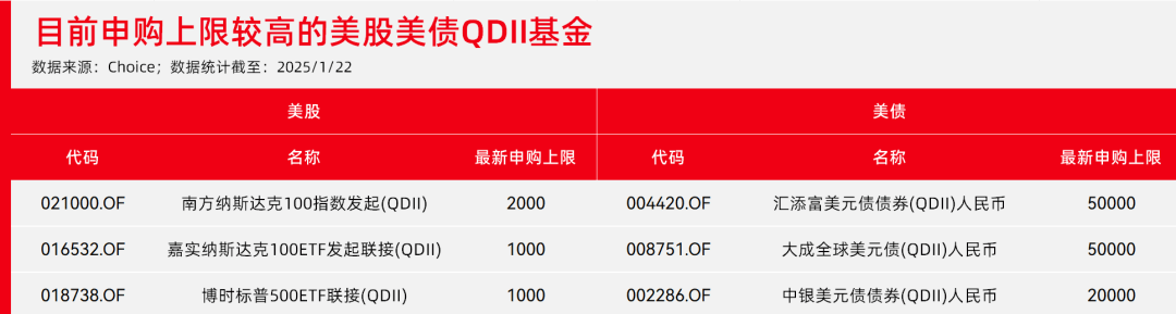 近期多支QDII基金限购放宽,给我们布局美国资产提供了一个不错的时间窗口。已有三支美股纳斯达克和标普500联接基金将申购上线提升至1000元及以上水平,一些美元债基金也提高了申购上限。