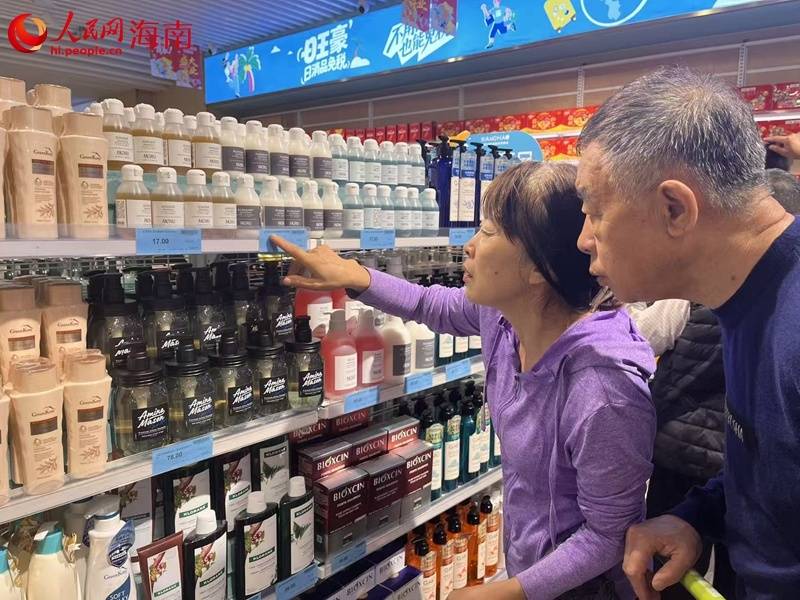消费者在海口天街旺豪日消品免税店内选购日化品。人民网记者 符小叶摄