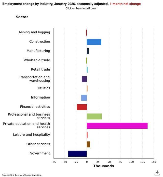 分项来看,当月医疗保健行业新增8.2万人,为2020年7月以来最大增幅,这一增幅远高于2025年月均3.3万人的水平。社会援助行业新增4.2万人。建筑业新增3.3万人,主要由非住宅专业工程承包商招聘带动,部分机构将其归因于支撑人工智能所需的数据中心建设。专业与商业服务行业新增3.4万人。
