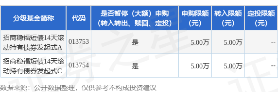 证券之星消息,2月12日招商基金管理有限公司发布《关于暂停招商稳福短债14天滚动持有债券型发起式证券投资基金大额申购(含定期定额投资)和转换转入业务的公告》。公告中提示,为保障基金的平稳运作,维护基金份额持有人利益,自2026年2月13日起暂停招商稳福短债14天滚动持有债券型发起式证券投资基金大额申购(含定期定额投资)和转换转入业务,申购、转换转入上限金额为5.0万元,下属分级基金调整明细如下: