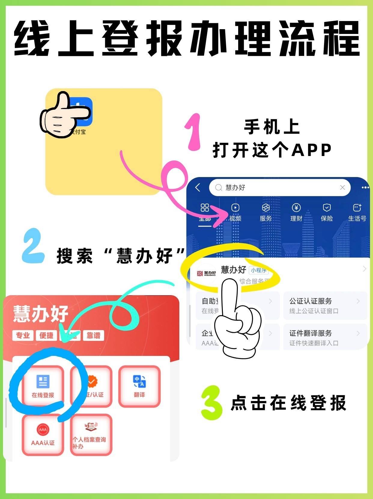 如果你需要办理债权转让公告登报,现在手机上也可以直接办理。线上办理流程超简单:搜索“慧办好”,进入后选择“在线登报”服务,填写信息、上传文件,在线支付费用,然后坐等公告登报。全程手机操作,省时省力,轻松搞定!