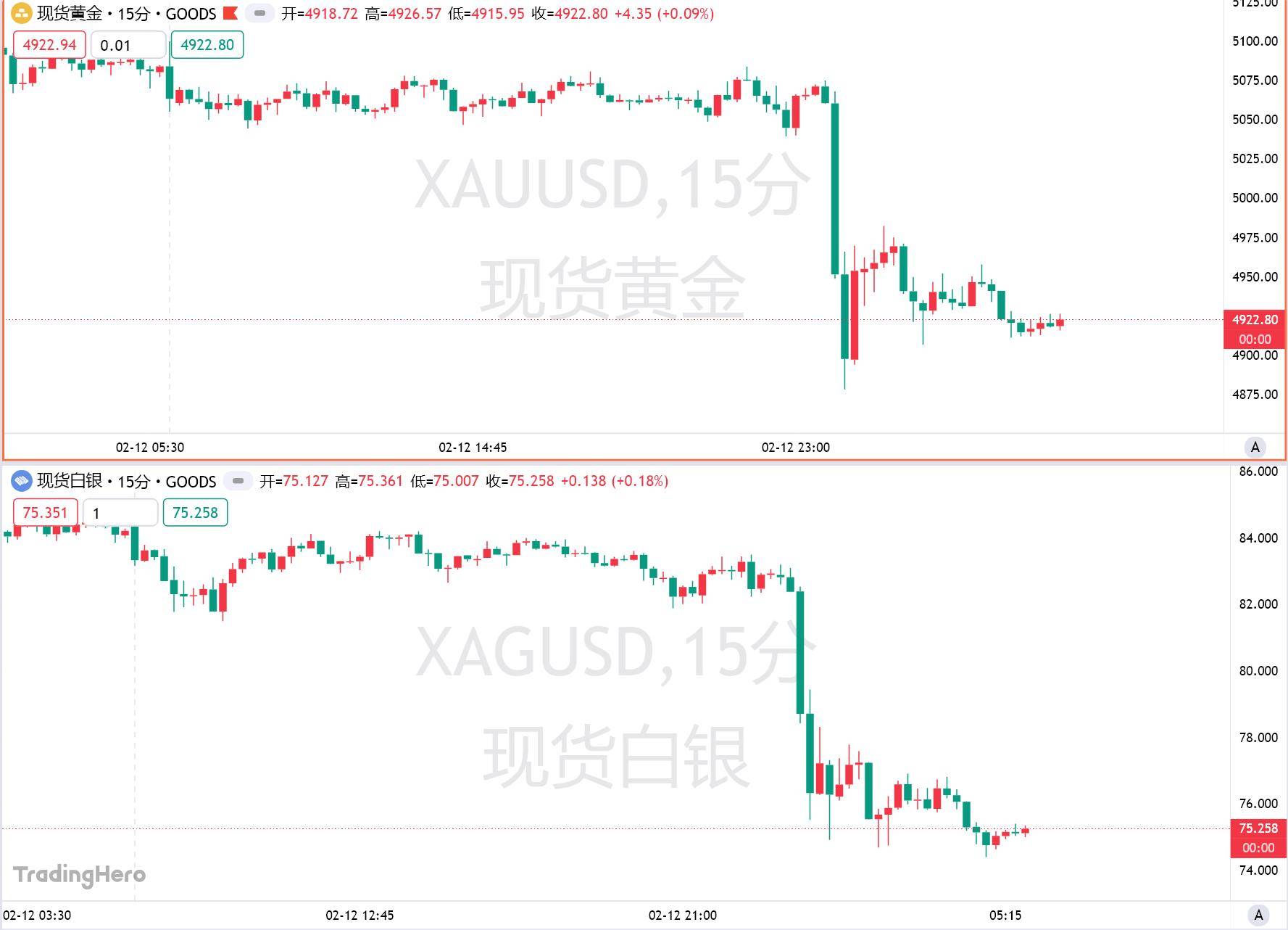 国际现货黄金美盘跳水,30分钟内跌近200美元,最低触及4878.37美元/盎司,截止收盘跌超3%。现货白银日内重挫近9美元,收盘跌至75.26美元/盎司,日内10.64%。伦敦金属交易所铜价一度下跌2.9%。