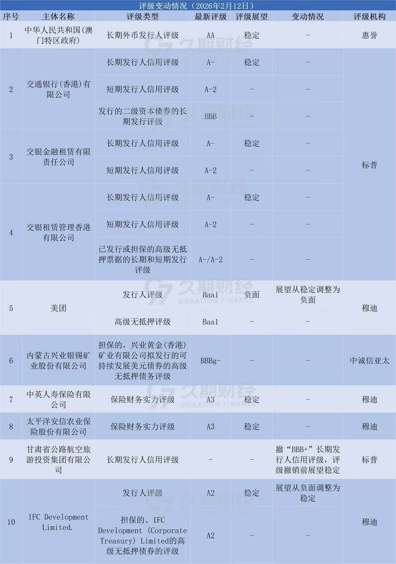 今日,惠誉确认中国澳门特区“AA”长期外币发行人评级,共9家公司评级获机构更新: