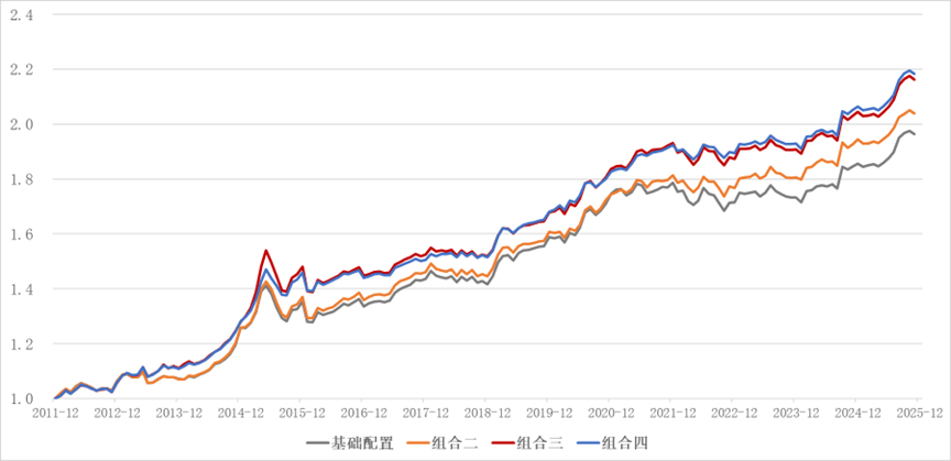 为验证上述绝对收益管理框架的有效性,本文以股债20/80组合构建年金基金基础配置组合,20%采用沪深300全收益指数,80%采用中债-企业债AAA财富(1-3年)指数。之后,依次将部分权益资产替换为红利、创业板资产,还结合定期再平衡机制,回测2012年1月1日至2025年11月30日期间不同组合的净值表现。