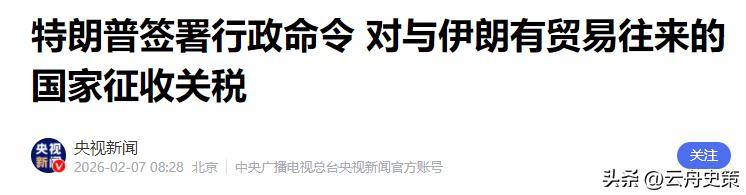2026年2月7日,白宫发布了一道让全球震惊的行政命令,特朗普签署了命令,对所有与伊朗有贸易往来的国家加征25%的关税。这一天,恰巧是前一天在阿曼马斯喀特举行的美伊会谈的第二天。在这场微妙的对话中,伊朗外长阿拉格齐、特朗普的女婿库什纳与美国官员威特科夫在两个房间里,通过阿曼外交大臣来回传话。