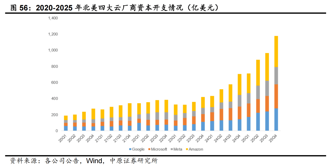 而AI作为全球的投资主线,仍然是值得重点关注的方向。相比于AI应用落地的不确定性,位于产业链上游的AI基础设施则展现出更强的确定性。2025年四季度四大云厂商(谷歌、微软、Meta、亚马逊)的资本开支同比增长67%,2026年增长延续,资本支出合计预计超过6,700亿美元,同比大幅增长超60%,AI基础设施建设仍处于大规模投入阶段。