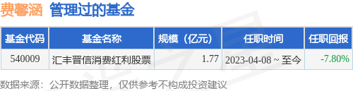 费馨涵女士:中国国籍,硕士研究生。曾任汇丰晋信基金管理有限公司助理研究员、研究员,现任汇丰晋信基金管理有限公司高级研究员。2023年4月8日担任汇丰晋信消费红利股票型证券投资基金基金经理。