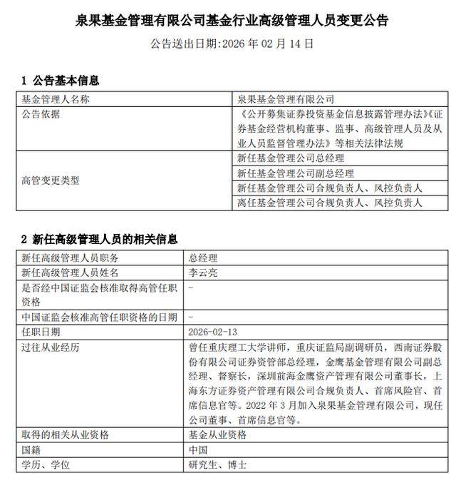 2月14日,泉果基金发布公告称,公司创始合伙人李云亮出任总经理一职,此前由董事长任莉代行总经理职务。同步调整还包括:创始合伙人、副总经理姜荷泽兼任财务负责人,孙媛担任合规负责人和风控负责人,姚钟骁担任副总经理。此前,赵诣、刚登峰已升任总经理助理,分别兼任公募投资部和研究部负责人。